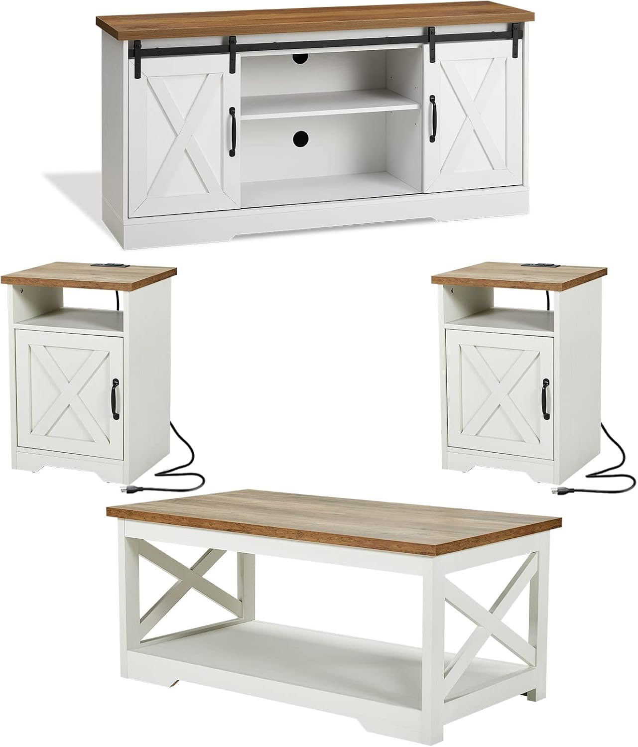 AMERLIFE 4-Piece Farmhouse Table Set Includes Sliding Barn Door TV Stand, Coffee Table& Two End Tables, Side Table with Charging Station and USB Ports, for Living Room, Bedroom, Distressed White, 66″