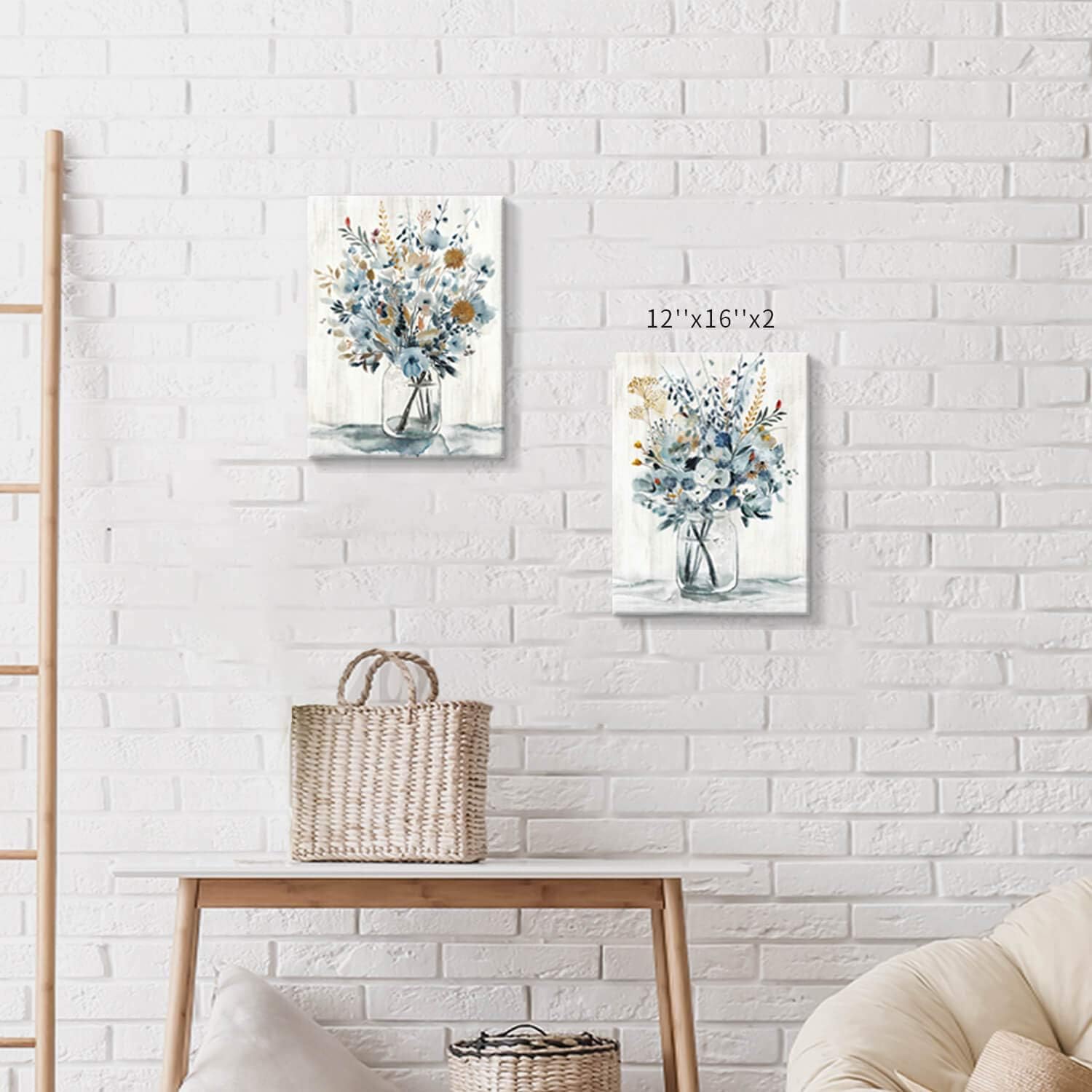 Floral Canvas Wall Art Prints: Abstract Blossom Flower Bouquet in Glass Bottle Picture Print on Canvas Small Size for Dining Room (12” x 16” x 2 Panels)
