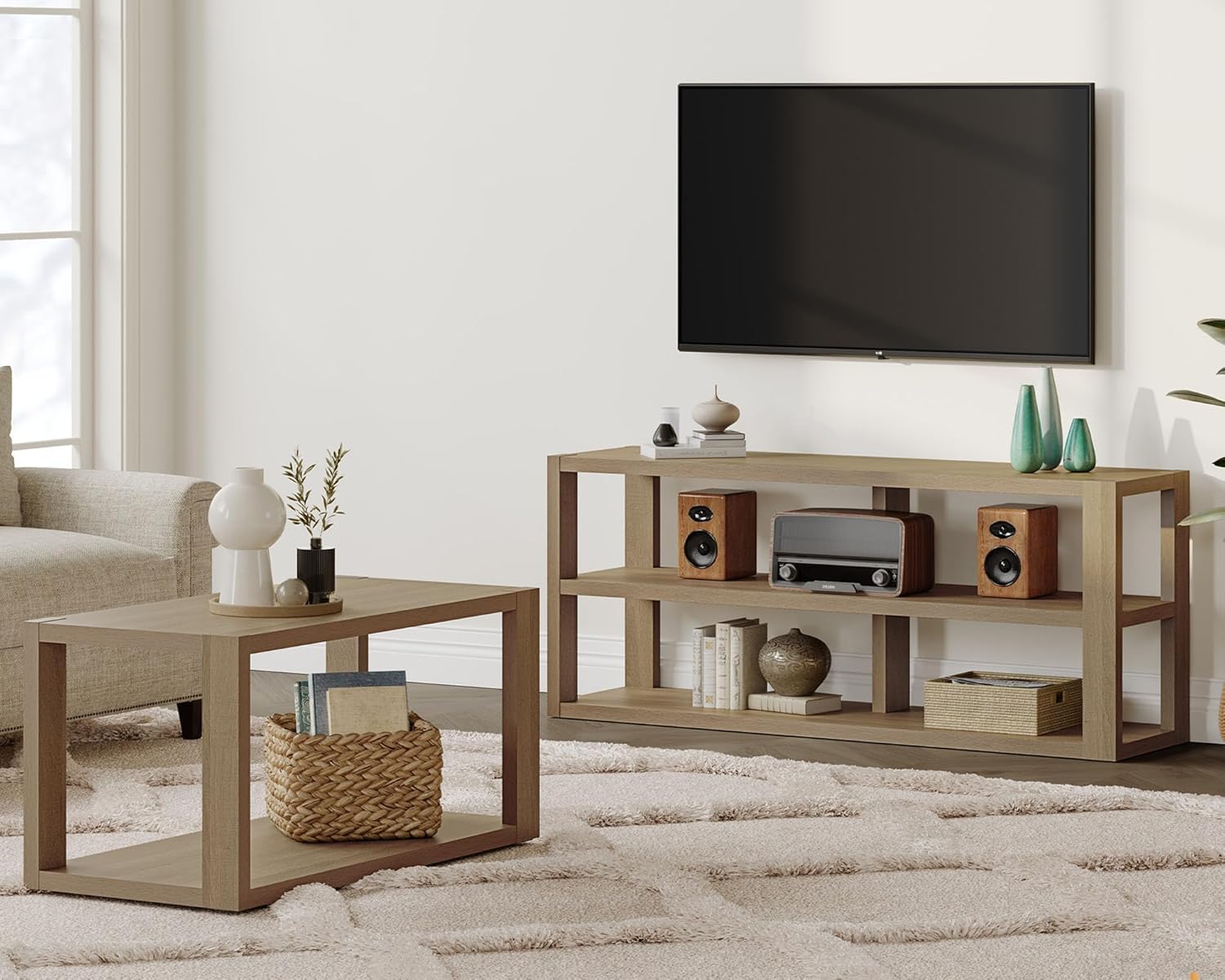SICOTAS TV Stand and Coffee Table Set of 2 – Farmhouse Wood TV Console Table Entertainment Center Table with Open Storage Shelves Rectangle Center Table Wood Look Accent Table for Living Room